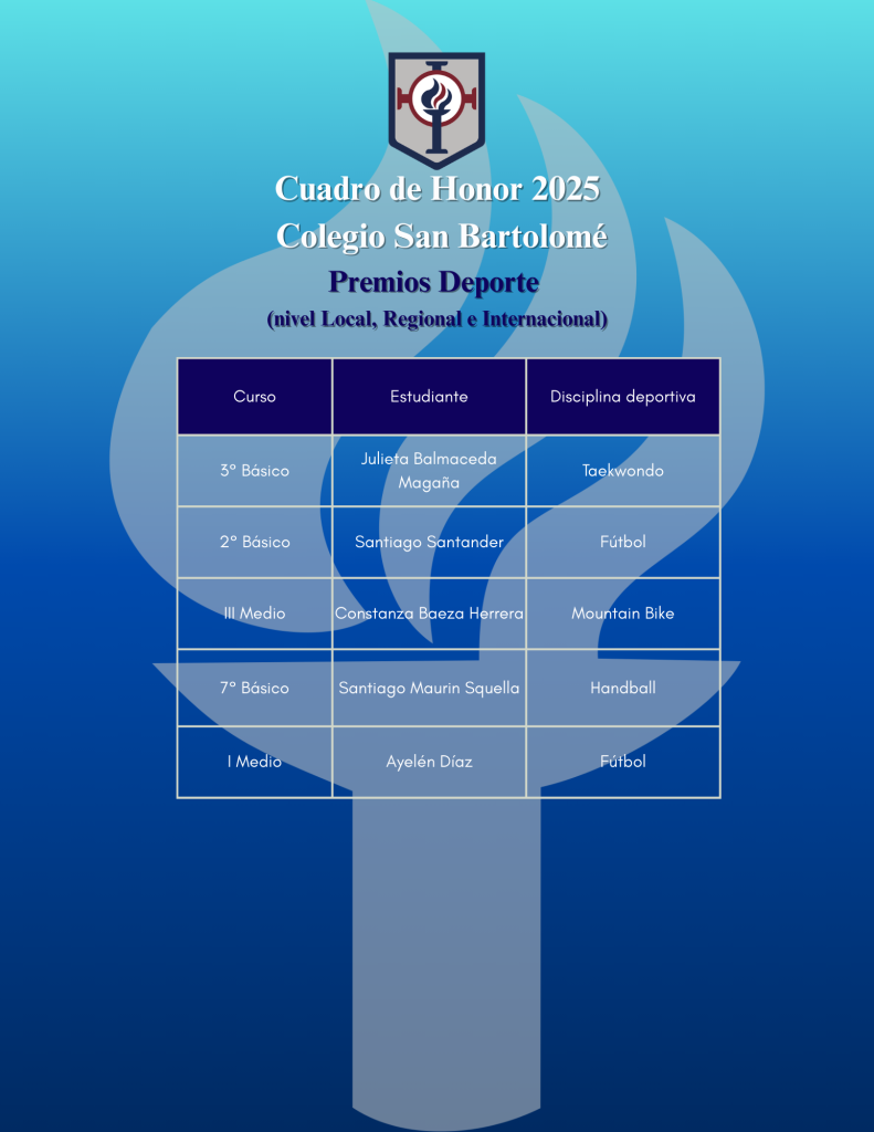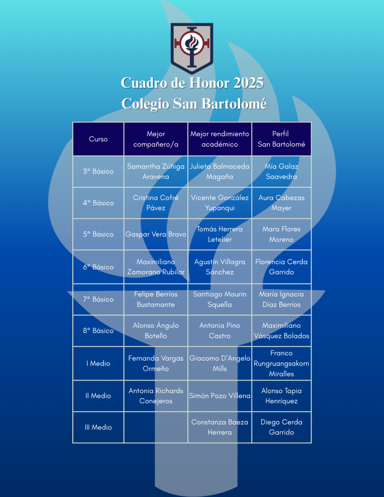 Con mucho orgullo presentamos el Cuadro de Honor 2025, una muestra del esfuerzo, compromiso y valores que distinguen a nuestros estudiantes. Este reconocimiento destaca a quienes, a lo largo del año, sobresalieron por su compañerismo, rendimiento académico, espíritu deportivo y vivencia del perfil formativo de nuestro colegio. Felicitamos a cada uno de ellos y a sus familias por este importante logro, que refleja el trabajo constante de toda nuestra comunidad educativa.